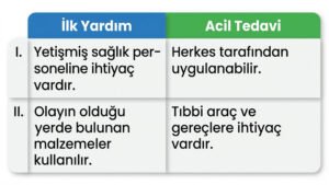 11. İlk Yardım ile Acil Tedavi arasındaki farklarla ilgili olarak tabloda verilen bilgiler için ne söylenebilir?