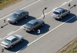 21. Şekle göre, hangi numaralı araç sürücüsünün yaptığı, öndeki aracı geçme kuralına aykırıdır?