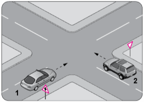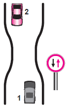 34. Şekildeki gibi daralan bir yola gelen iki araç için aşağıdakilerden hangisi doğrudur?
