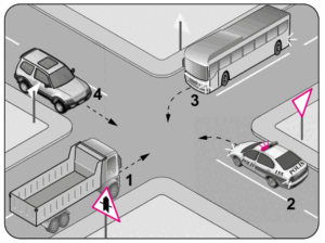 28. Şekildeki gibi bir kavşakta karşılaşan araçların geçiş hakkı sıralaması nasıl olmalıdır?