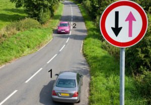 20. Şekildeki gibi daralan bir yola gelen iki araç için aşağıdakilerden hangisi doğrudur?
