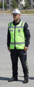 33. Şekildeki trafik görevlisinin duruş pozisyonuna göre, aşağıdakilerden hangisi doğrudur?