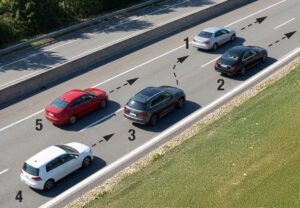 44. Şekle göre, tek yönlü yolda 3 numaralı aracın sürücüsü şerit değiştirebilmek için aşağıdakilerden hangisinin gerçekleşmesini beklemelidir?